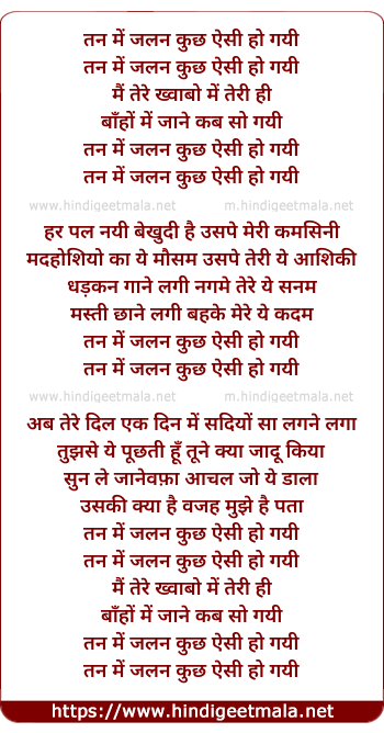 Lyrics of Tan Mein Jalan Kuch Aisi Ho Gayi - तन में जलन कुछ ऐसी हो गयी