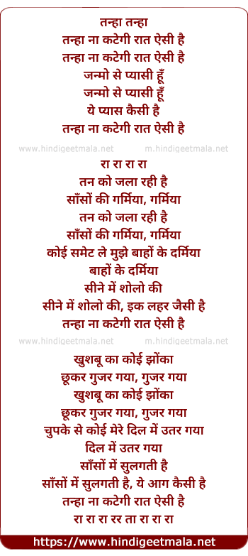Lyrics of Tanaha Na Kategi Raat Aisi Hai - तन्हा ना कटेगी रात ऐसी है