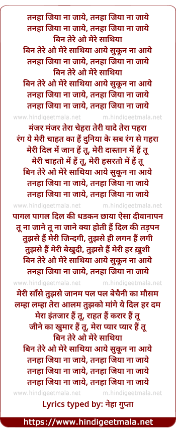 Lyrics of Tanha Jiya Na Jaye (Remix) - तनहा जिया ना जाये, तनहा जिया ना जाये
