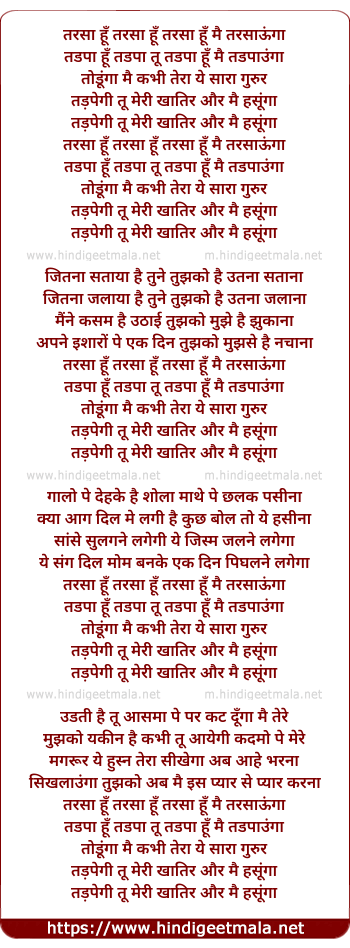 Lyrics of Tarsa Hu Tarsa Hu Mai Tarsaunga - तरसा हूँ तरसा हूँ मै तरसाऊंगा