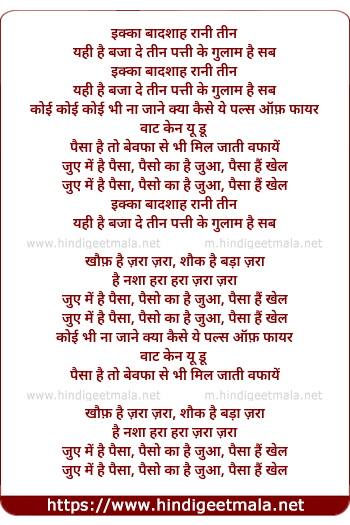Lyrics of Teen Patti Ke Gulam (Remix) - इक्का बादशाह रानी तीन