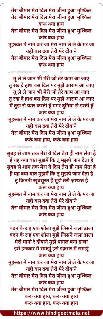 Lyrics of Tera Bimaar Mera Dil, Mera Jina Huwa Mushkil - तेरा बीमार मेरा दिल, मेरा जीना हुआ मुश्किल