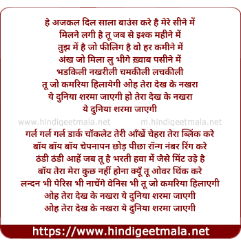Lyrics of Tera Dekh Ke Nakhra Ye Duniya Sharma Jaayegi - तेरा देख के नखरा ये दुनिया शर्मा जायेंगी