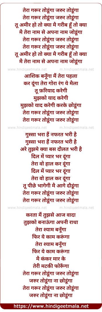 Lyrics of Tera Guroor Todunga Jarur Todunga - तेरा गरूर तोडूंगा जरुर तोडूंगा