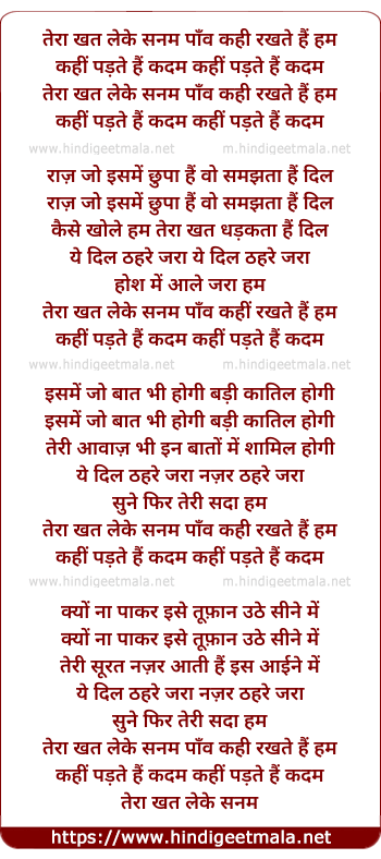 Lyrics of Tera Khat Leke Sanam, Paanv Kahin Rakhte Hai Hum - तेरा खत लेके सनम पाँव कही रखते हैं हम