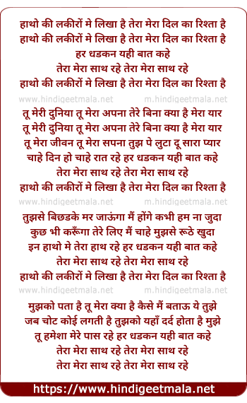 Lyrics of Tera Mera Saath Rahe (Male) - हाथो की लकीरों मे लिखा है, तेरा मेरा दिल का रिश्ता है