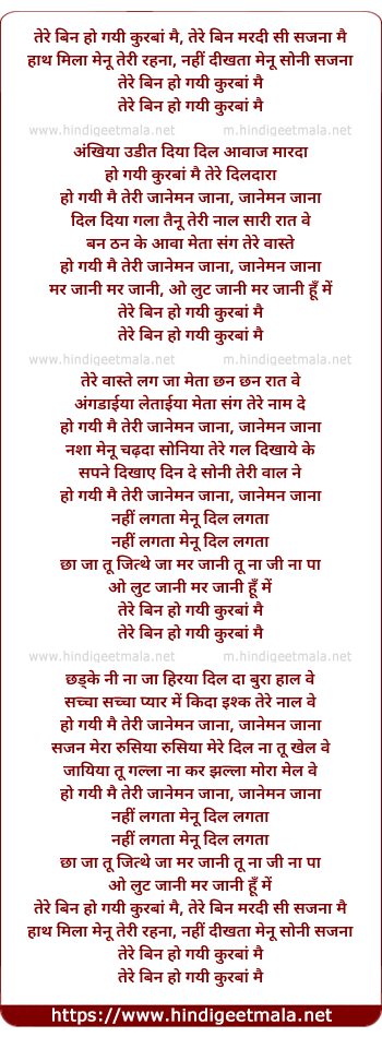 Lyrics of Tere Bin Ho Gayi Kurbaan Main - तेरे बिन हो गयी कुरबां मैं