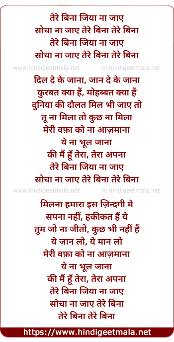 Lyrics of Tere Bina Jiya Na Jaye Socha Na Jaye - तेरे बिना जिया ना जाए सोचा ना जाये