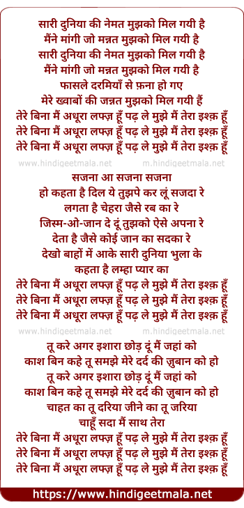 Lyrics of Tere Bina Mai Adhura Lafz Hun - तेरे बिना मैं अधुरा लफ्ज़ हूँ