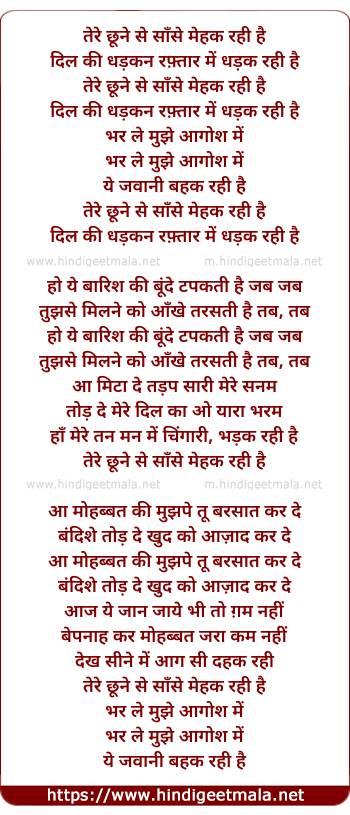 Lyrics of Tere Chhune Se Saansein Mehak Rahi Hai - तेरे छूने से साँसे मेहक रही है