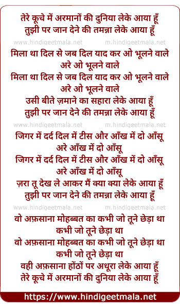 Lyrics of Tere Kuche Me Armano Ki Duniya Leke Aaya Hu - तेरे कूचे में अरमानों की दुनिया लेके आया हूँ