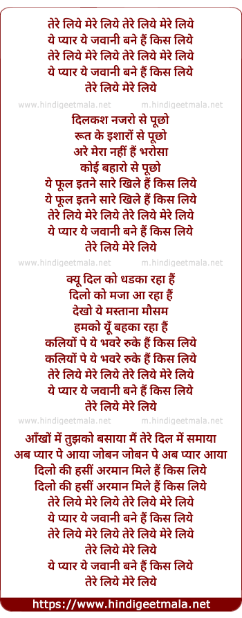 Lyrics of Tere Liye Mere Liye Ye Pyar Ye Jawani - तेरे लिये मेरे लिये ये प्यार ये जवानी