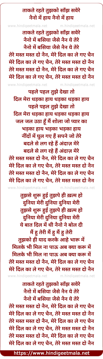 Lyrics of Tere Mast Mast Do Nain (2) - ताकते रहते तुझको साँझ सवेरे