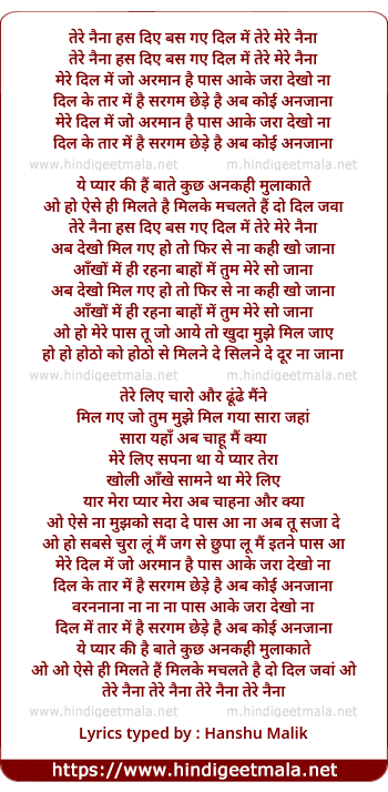 Lyrics of Tere Naina Has Diye - तेरे नैना हस दिए