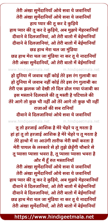 Lyrics of Teri Ankha Surmedaniya - तेरी अंखा सुर्मेदानियाँ