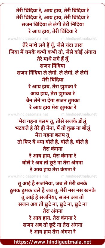 Lyrics of Teri Bindiyaa Re, Aaye Haaye Teri Bindiyaa Re - तेरी बिंदिया रे