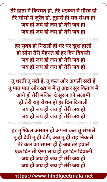 Lyrics of Jai Ho Teri Jai Ho - जय हो तेरी जय हो