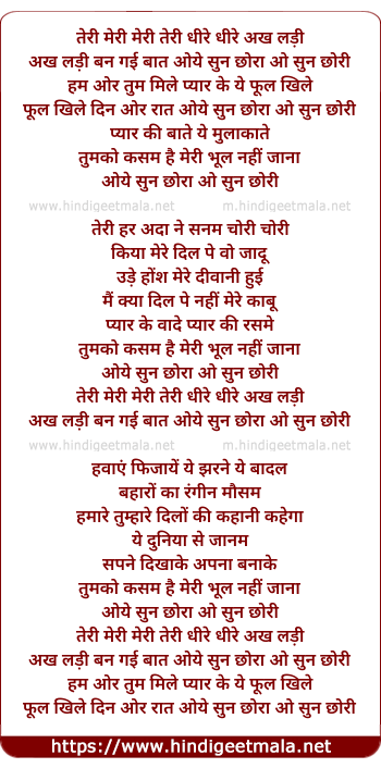 Lyrics of Terii Meri Meri Teri Dhire Dhire Aankh Ladi - तेरी मेरी मेरी तेरी धीरे धीरे अख लड़ी