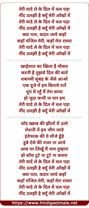 Lyrics of Teri Yaade Leke Dil Mein Chal Pada Hu - तेरी यादे लेके दिल में चल पड़ा हूँ