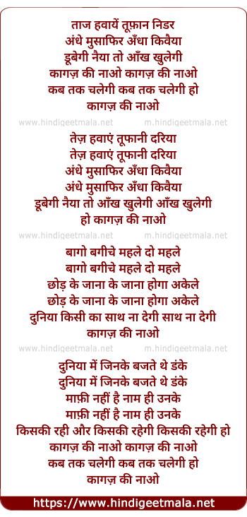 Lyrics of Tez Hawaye Toofani Dariya - तेज़ हवाएं तूफानी दरिया