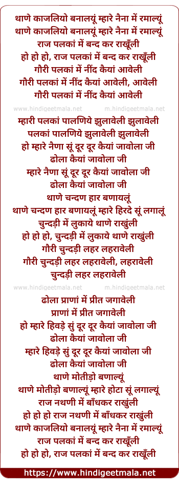 Lyrics of Thaane Kaajaliyo Banaalayun Mhaare Nainaa Men Ramaalyun - थाणे काजलियो बनालयूं म्हारे नैना में रमाल्यूं