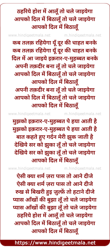 Lyrics of Thahariye Hosh Men Aa Lun To Chale Jaaiyegaa - ठहरिये होश में आलूँ तो चले जाइयेगा