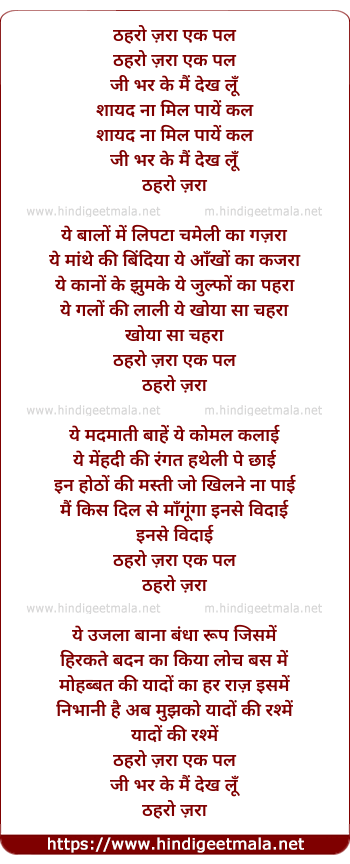 Lyrics of Thahro Zara Ek Pal - ठहरो ज़रा एक पल