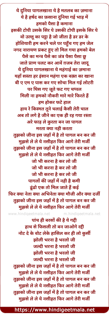 ye duniya pagalkhana hai ye hai mahangai ka zamana
