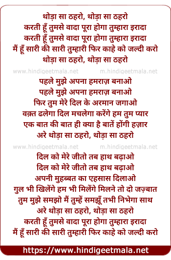 Lyrics of Thoda Sa Thehro Karti Hu Tumse Vada Pura Hoga Tumhara Vada - थोड़ा सा ठहरो करती हु तुमसे वादा पूरा होगा तुम्हारे वादा