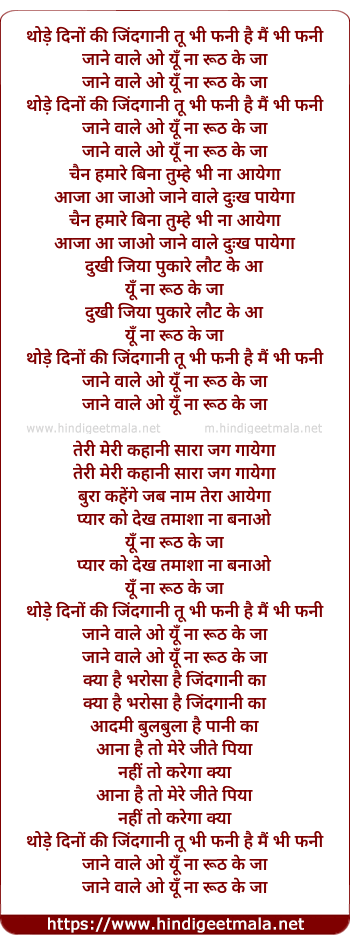 Lyrics of Thode Dino Ki Zindagani - थोड़े दिनों की जिंदगानी तू भी फनी है मैं भी फनी