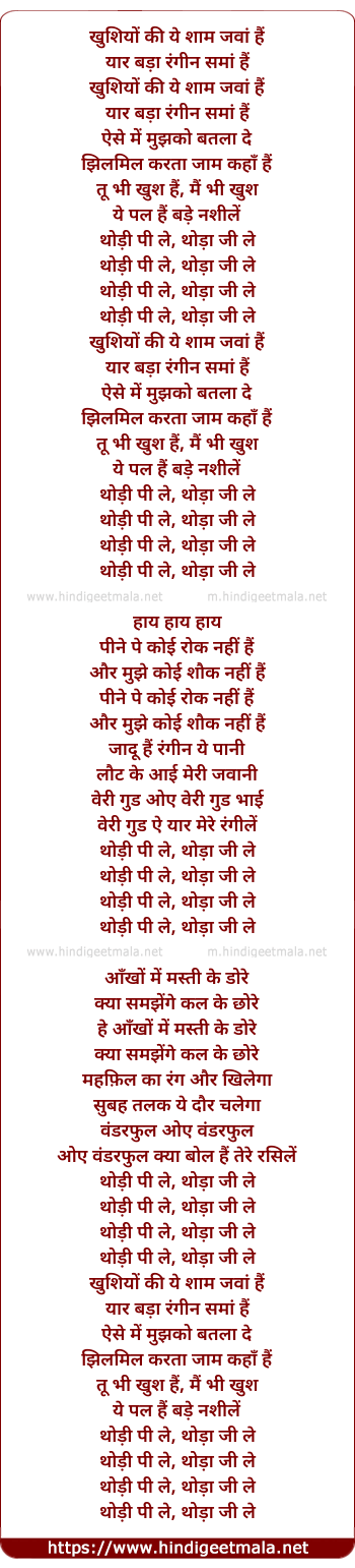 Lyrics of Thodi Peele Thoda Jeele (Jeele Peele) - खुशियों की ये शाम जवां हैं