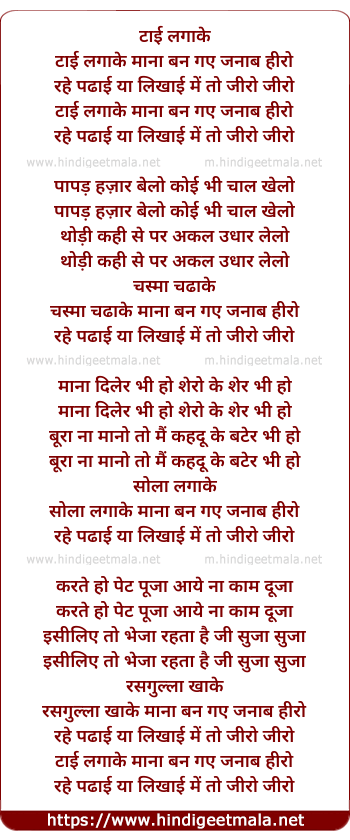 Lyrics of Tie Laga Ke Mana Ban Gaye Hero - टाई लगाके माना बन गये जनाब हीरो