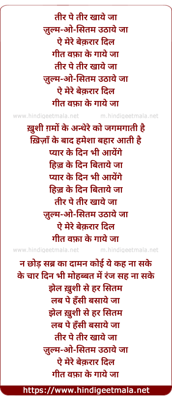 Lyrics of Tir Pe Tir Khaaye Jaa Zulm O Sitam Uthaaye Jaa - तीर पे तीर खाये जा ज़ुल्म-ओ-सितम उठाये जा