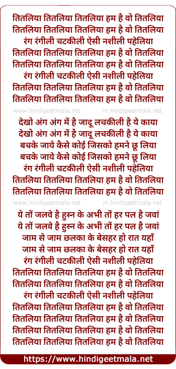 Lyrics of Titliya Titliya - तितलिया तितलिया
