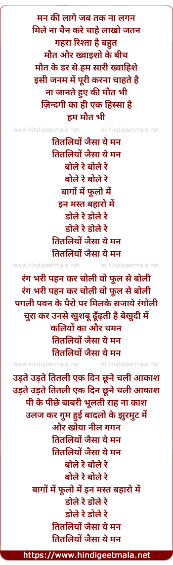 Lyrics of Titliyon Jaisa Mann - मन की लागे जब तक ना लगन