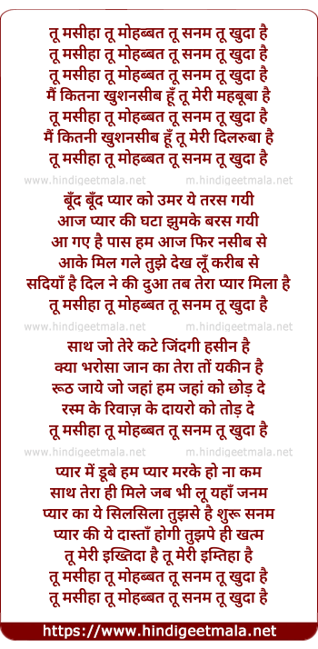 Lyrics of To Massiah Tu Mohabbat Tu Sanam - तू मसीहा तू मोहब्बत तू सनम