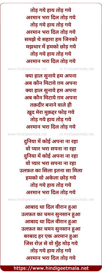 Tod Gaye Haye Tod Gaye Araman Bhara Dil Tod Gaye - तोड़ गये हाय तोड़ गये अरमान भरा दिल तोड़ गये
