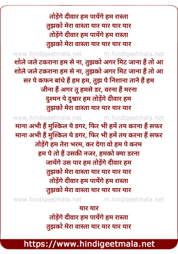 Lyrics of Todenge Deewaar Hum, Payege Hum Rasta Tujhko Mera Vasta Yar Ya - तोड़ेंगे दीवार हम, पायेंगे हम रास्ता तुझको मेरा वास्ता यार या