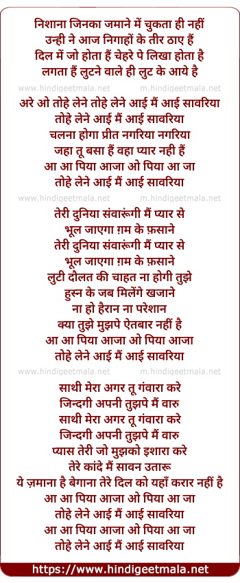 Lyrics of Tohe Lene Aayi Main Aayi Sanwariya - तोहे लेने आई मैं आई संवारियाँ