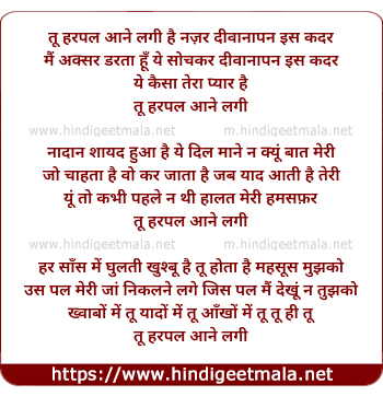 Lyrics of Too Har Pal Aane Lagee Hain Najar - तू हरपल आने लगी है नज़र दीवानापन इस कदर