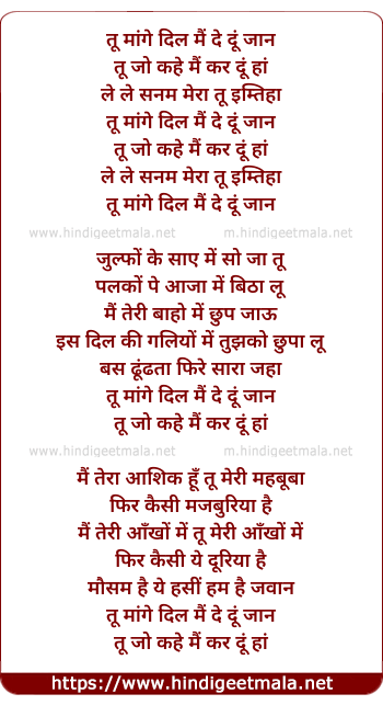Lyrics of Too Mange Dil, Mai De Du Jan - तू मांगे दिल, मैं दे दूं जान