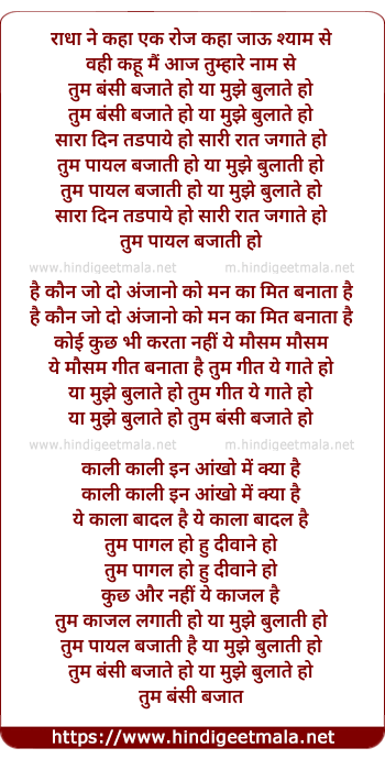 Lyrics of Tum Bansi Bajate Ho Ya Mujhe Bulate Ho - तुम बंसी बजाते हो या मुझे बुलाते हो
