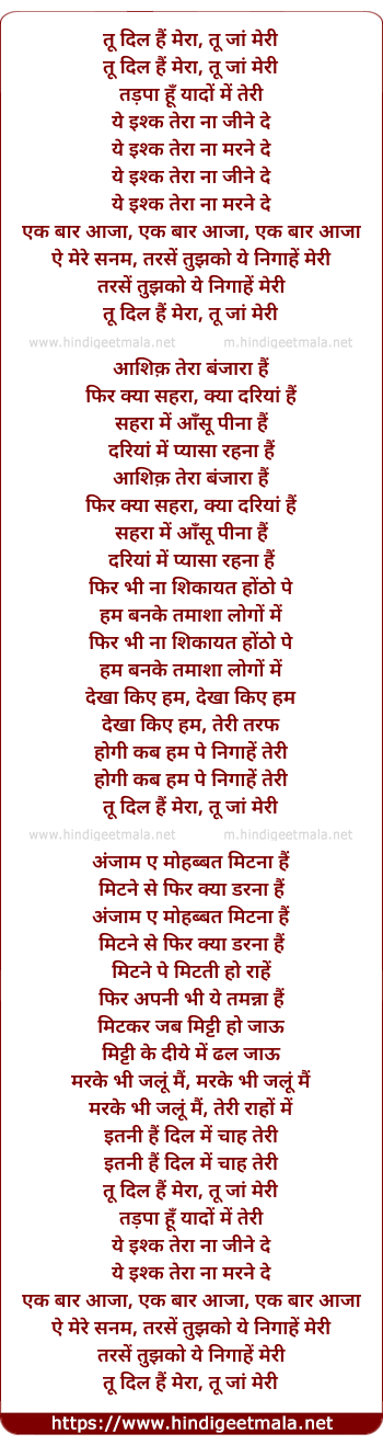 Lyrics of Tu Dil Hai Mera - तू दिल हैं मेरा, तू जां मेरी