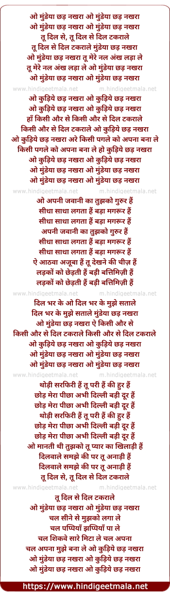 Lyrics of Tu Dil Se Dil - ओ मुंडेया छड़ नखरा