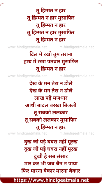Lyrics of Tu Himmat Na Haar Musafir - तू हिम्मत न हार मुसाफिर