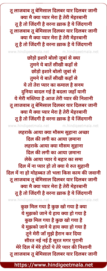 tu laajawaab tu bemisaal dilbar yaar dilbar jani