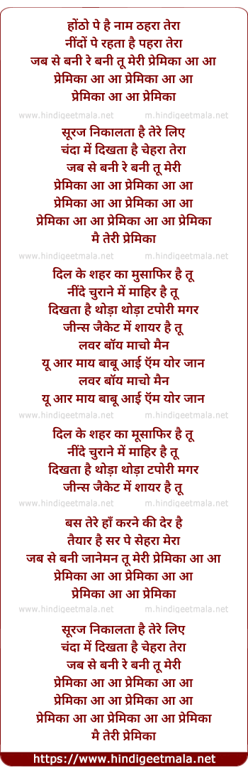 Lyrics of Tu Meri Premika - तू मेरी प्रेमिका