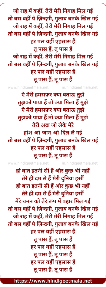 Lyrics of Tu Pass Hai - जो राह में कहीं, तेरी मेरी निगाह मिल गई
