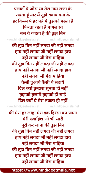 Lyrics of Tujh Bin Nahi Lagdaa Jee - तुझ बिन नहीं लगदा जी