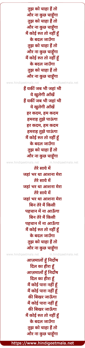 Lyrics of Tujh Ko Chaha - तुझ को चाहा हैं तो